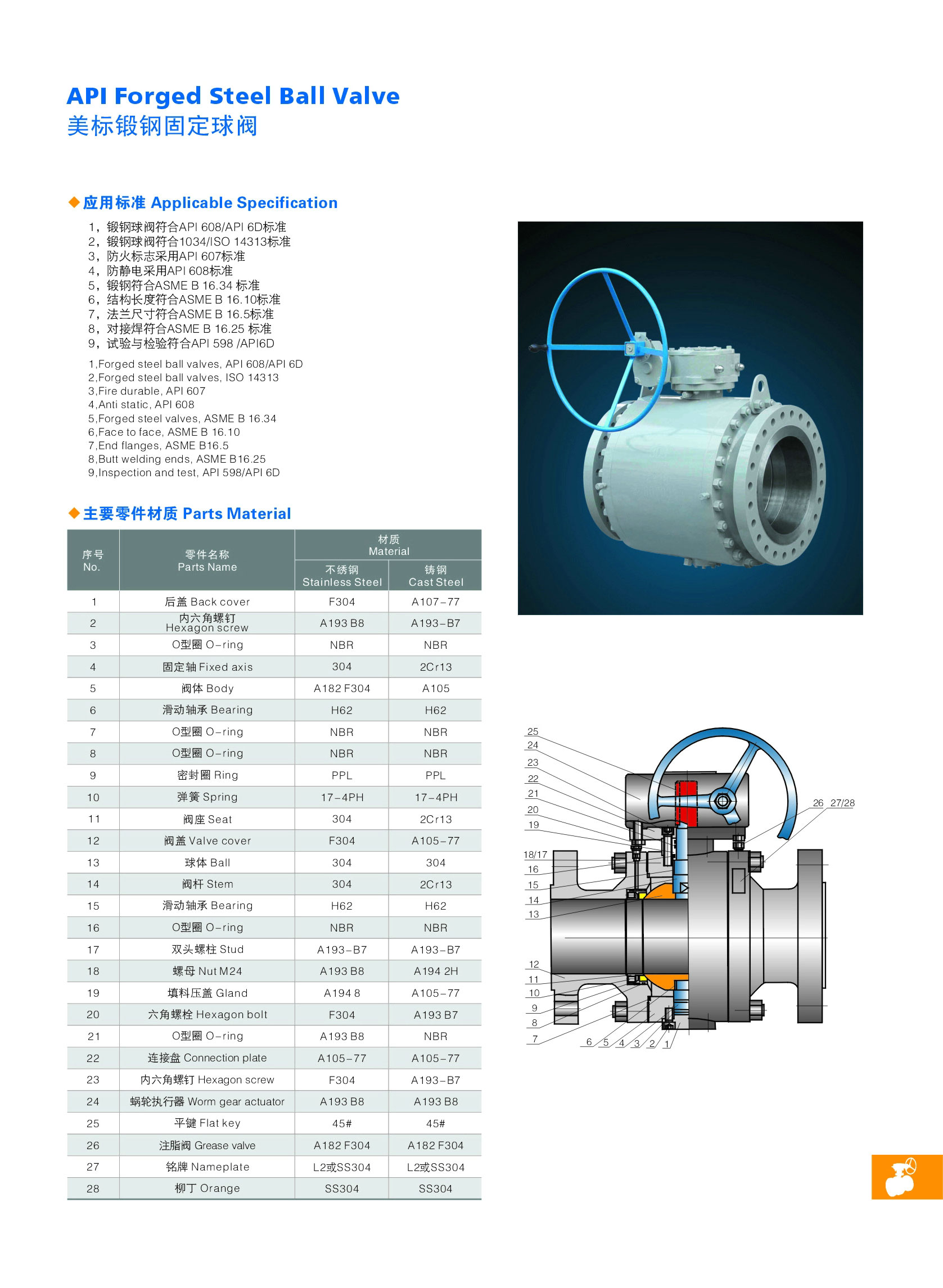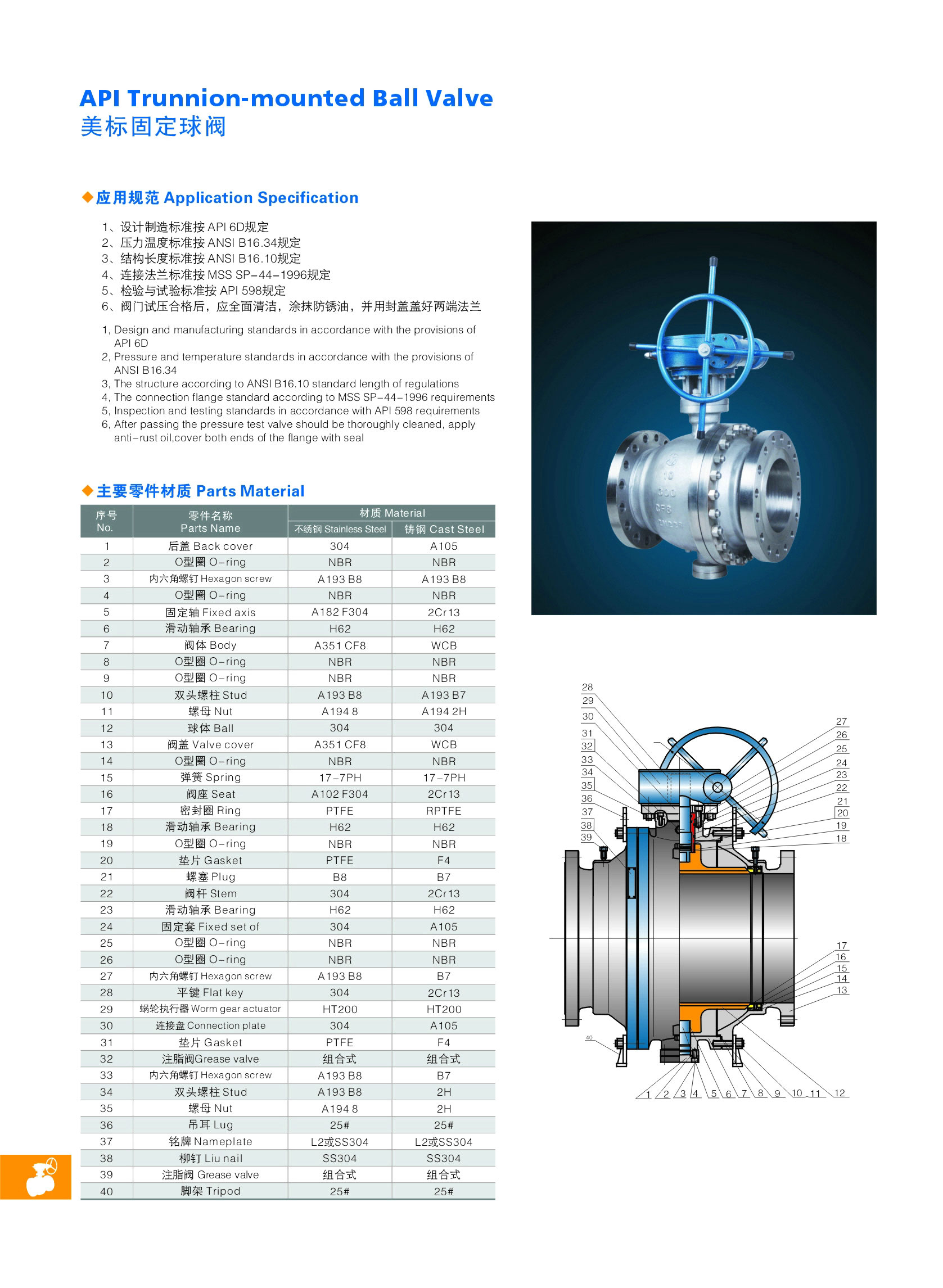 Q347Y-16/25C大口徑金屬硬密封固定式球閥是新一代高性能球閥,適用于長輸管線和一般工業(yè)管線,其強(qiáng)度、安全性、耐惡劣環(huán)境性等在設(shè)計(jì)時(shí)進(jìn)行了特殊考慮,適用于各種腐蝕性和非腐蝕性介質(zhì)。它與浮動球閥相比,工作時(shí),閥前流體壓力在球體上產(chǎn)生的作用力全部傳遞給軸承,不會使球體向閥座移動,因而閥座變形小,密封性能穩(wěn)定、使用壽命長,適用于高壓、大口徑場合。先進(jìn)的彈簧預(yù)閥座組件,具有自緊特性,實(shí)現(xiàn)上游密封。每閥有兩個閥座,每個方向都能密封因而安裝沒有流向限制,是雙向。本閥有二塊式和三塊式兩種閥體結(jié)構(gòu),中法蘭用螺栓連接,密封采用增強(qiáng)聚四氟乙烯鑲?cè)氩讳P鋼圈內(nèi),鋼圈后部設(shè)有彈簧保證閥座緊貼球體,保持密封。上下閥桿均設(shè)有PTFE軸承,減少磨擦,操作省力,小軸底部沒有調(diào)整片,保證球與密封圈的接處位置。采用全通徑的結(jié)構(gòu)使閥門流量孔么與管線內(nèi)徑一致,以便管線清掃。