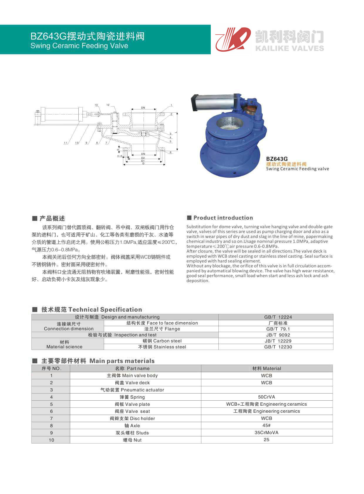 3、BZ643G擺動式陶瓷進料閥料口全流通無阻擋物有吹堵裝置,耐磨性能強,密封性能好、啟動負荷小卡灰及結(jié)灰現(xiàn)象少。